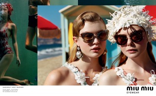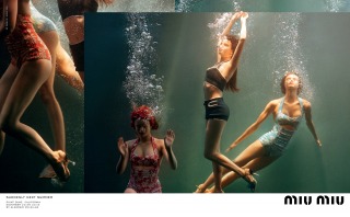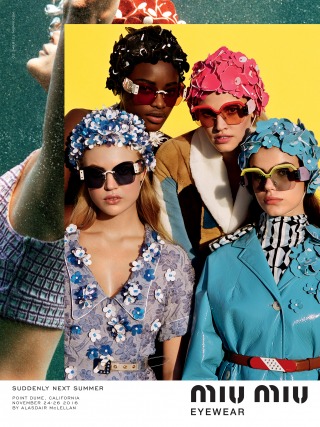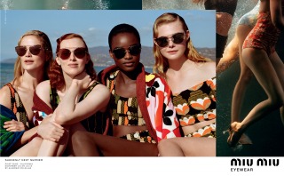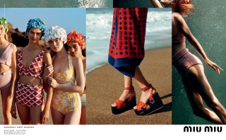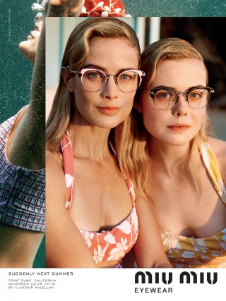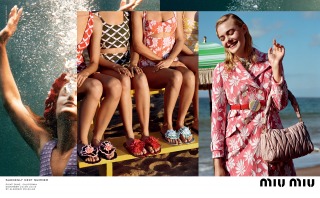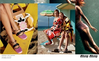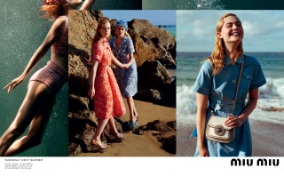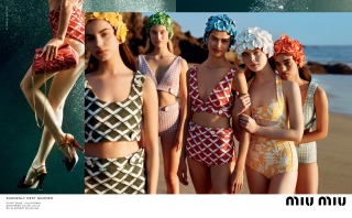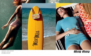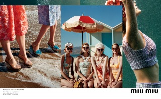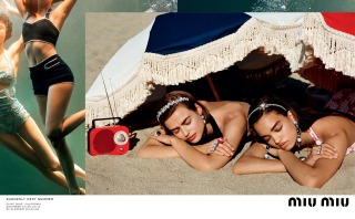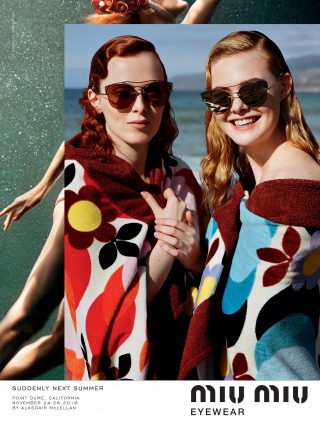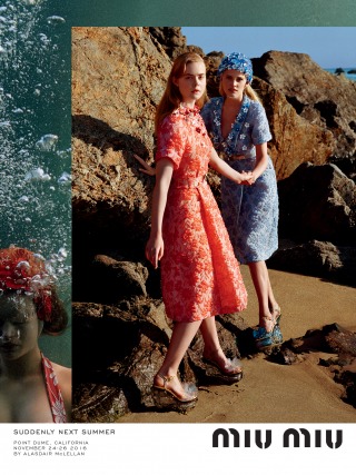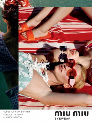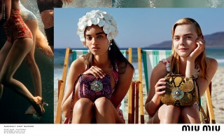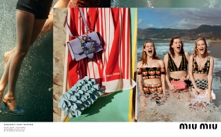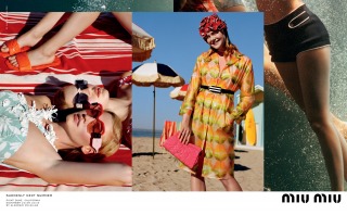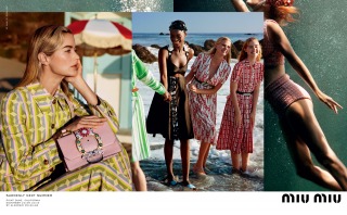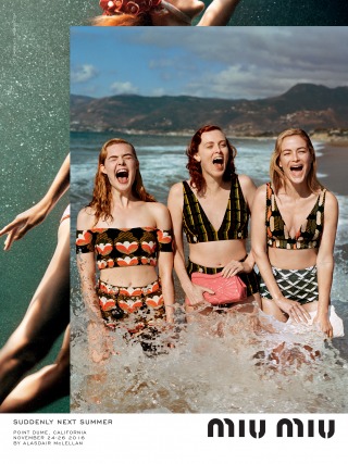 “Suddenly Next Summer”, Miu Miu’s Spring Summer 2017 campaign imagines a group of friends led by actress Elle Fanning on a playful daytime rendezvous along the beaches of California. An ode to vintage beach and surf imagery from the 40’s and 50’s, the campaign creates vibrant tableaux set against the Malibu shores. The campaign film features an original 1947 Pathé voice over, where the narrator offers up commentary that is somehow both anachronistic and current.
